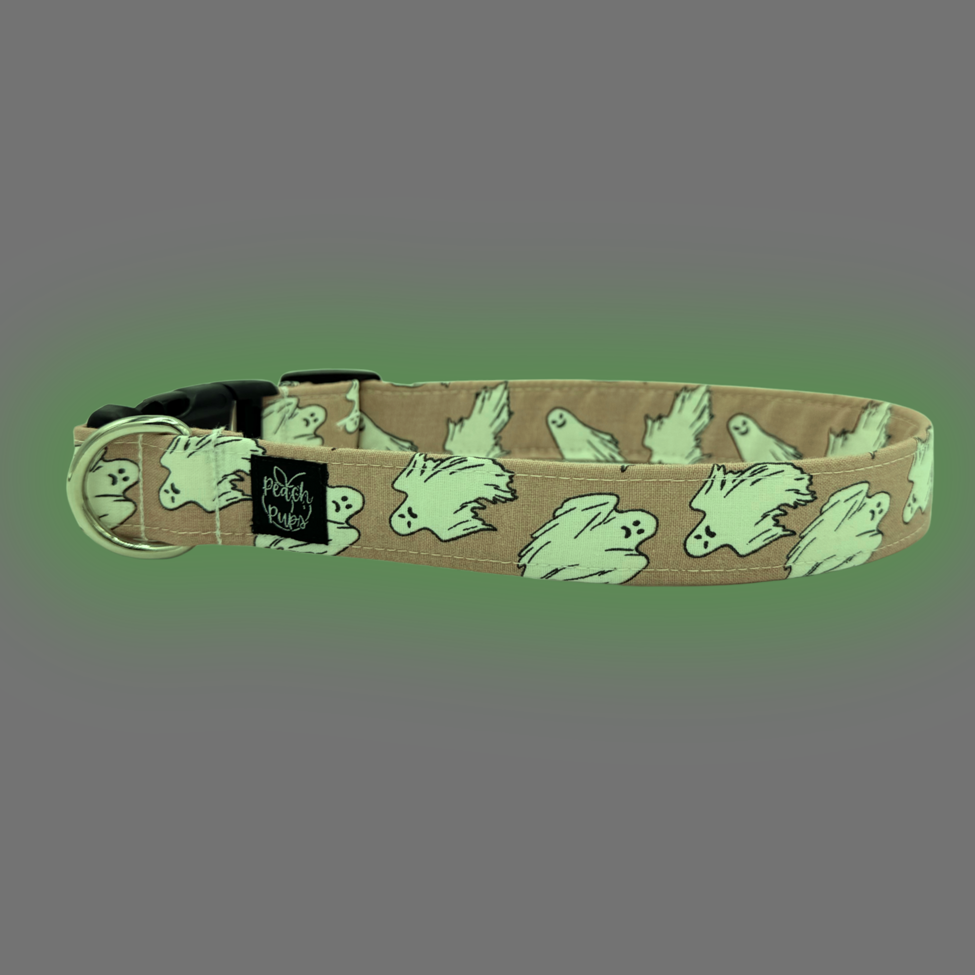 Our collars are fabric wrapped with nylon webbing as the base to ensure strength and durability to hold your dog. The clip and adjuster-piece are black, hard plastic and the metal ring is for a leash and tags to attach to.